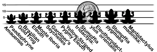 ![]() Лягушка Paedophryne amauensis, сидящая на монете в 10 центов США (диаметр 17,91 мм) | ||||||||||