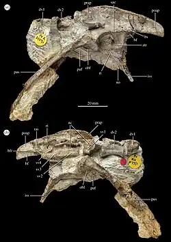 - Изолированный спинной позвонок отличается от такового других ранних неотеропод отсутствием дополнительного сочленения, называемого hyposphene-hypantrum и наличием расширения передней части остистого отростка.
