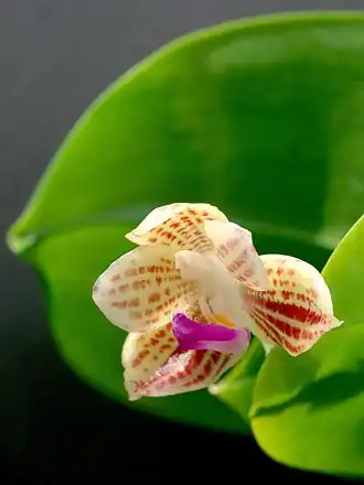 Цветки плотной текстуры, диаметром до 5 см, у некоторых экземпляров присутствует легкий фиалковый аромат. Фоновая окраска варьирует от белого до желтовато-зеленоватого или жёлтого, продольные полосы состоят из множества красно-коричневых точек.