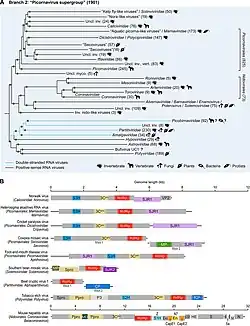 ![]() По часовой стрелке сверху слева: ПЭМ птичьего коронавируса, Penicillium stoloniferum, пикобирнавируса, вируса полиомиелита, калицивирус, астровируса, вирус оспы сливы, Nam Dinh. В центре: филогенетическое древо типа «Pisuviricota» | ||||||