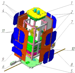 Это двухблоковый спутник кубической формы стандарта 2U CubeSat (2U означает, что спутник состоит из двух блоков-кубиков, то есть по форме это параллелепипед 10x10x20 см). Он относится к классу наноспутников, поскольку его вес более 1, но не превышает 10 кг. В рамном каркасе аппарата размещены электронные платы подсистем.