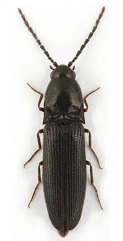 Щелкуны средних размеров. Тело удлинённое, одноцветное. Лоб сильно выпуклый, с продольным килем, клипеальная область широкая. Усики у самцов и самок слабо пиловидные начиная с четвёртого сегмента. Задний отросток переднегруди у передних тазиков с уступом. Передние тазиковые впадины сзади замкнутые на одну треть или на половинку своей ширины. Бедренные покрышки задних тазиков с сильно выступающим задним краем. Все сегменты лапок без лопастинок[1].