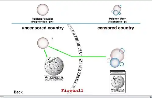 Psiphon — бесплатное и открытое программное обеспечение для обхода Интернет-цензуры, которое использует комбинацию безопасных коммуникационных и обфускационных технологий, таких как виртуальная частная сеть (VPN), SSH и веб-прокси. Psiphon представляет собой централизованно управляемую и географически разнообразную сеть тысяч прокси-серверов, использующих производительную архитектуру маршрутизации с одиночным и множественным переходом[1].