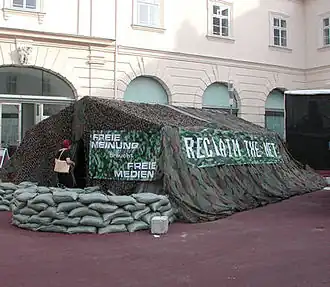 Когда политически правая Австрийская партия свободы и её лидер Йорг Хайдер начали набирать силу в Австрии, Public Netbase взяла на себя роль политического активиста в борьбе со всё более увеличивающимся давлением правительства. Хайдер в своей парламентской речи обвинил Public Netbase в поддержке детской порнографии и приравнял эротическое искусство Кристины Гёстль к коммерческим порносайтам на Британских Виргинских островах. Между тем Public Netbase спонсировала «виртуальную альтернативу крайне правого австрийского парламента», что принесло ей награду Австрийского веб-сопротивления за сайт, посвящённый противостоянию парламенту Хайдера.