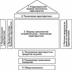 - центральная часть дома — это таблица, столбцы которой соответствуют техническим характеристикам, а строки потребительским. В клетках отмечается уровень зависимости, если она есть. Крышу дома представляют сведения о корреляции между техническими характеристиками;