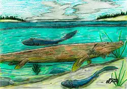 - 1 2 Daeschler E. B., Shubin N. H., Jenkins F. A. A Devonian tetrapod-like fish and the evolution of the tetrapod body plan (англ.) // Nature : journal. — 2006. — Vol. 440, iss. 7085. — P. 757—763. — ISSN 1476-4687. — doi:10.1038/nature04639. — . — PMID 16598249. Архивировано 27 мая 2017 года.