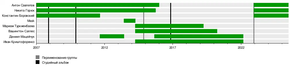 С июня 2013 года по апрель 2014 года группа гастролировала в составе двух солистов — Антона Савлепова и Никиты Горюка, а также неизвестного участника в маске. В апреле состав пополнился Иваном Криштофоренко, Вашингтоном Саллесом и Мариам Туркменбаевой[11].