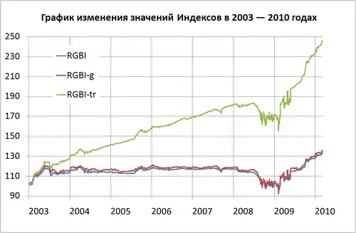 - Индекс государственных облигаций России — валовый (RGBI-g), ныне не рассчитывается, ранее считался по методике индекса «грязных» цен (англ.)(gross price index);