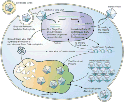 Проникнув в ядро, ДНК вируса запускает транскрипцию. В отличие от герпесвирусов для транскрипции ДНК Ranavirus должна быть связана с белками вириона. Сначала вирус использует РНК-полимеразу II хозяина для синтеза регуляторных белков и белков вирусной РНК-полимеразы II и ДНК-полимеразы. Транскрипция остальных белков вирус осуществляет уже собственной РНК-полимеразой. Транскрипты вируса подвергаются кэпированию, но не полиаденилированию, а также не содержат интронов. ДНК вируса в цитоплазме подвергается метилированию, причём метилируются 20-25 % цитозина в ДНК, что больше, чем у любого другого вируса позвоночных животных. Назначение метилирования в жизненном цикле неизвестно. Предполагается, что оно необходимо для ингибирования иммунного ответа, блокируя распознавание вирусной ДНК Толл-подобными рецепторами. В дальнейшем вирусные геномы используются в качестве шаблонов для синтеза ДНК на второй стадии, в результате чего образуются крупные конкатемеры из 10 и более вирусных геномов[3].