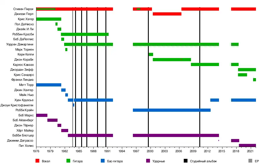 - Хуан Краусье (Juan Croucier) — бас-гитара, бэк-вокал (1982—1983, 1983—1992, 2012—2014, 2016—2021)