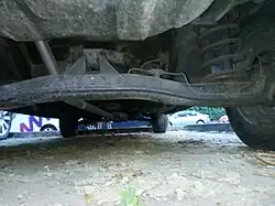 Задняя подвеска была более интересной конструкции. Штампованная поперечная балка связывала оси задних колёс. Балка крепилась к кузову с помощью продольных рычагов по краям и центрального треугольного (А-образного) рычага, призванного сопротивляться боковым нагрузкам, по центру. Рядом с каждым колесом была установлена цилиндрическая пружина внутри которой находился гидравлический амортизатор двустороннего действия[7].