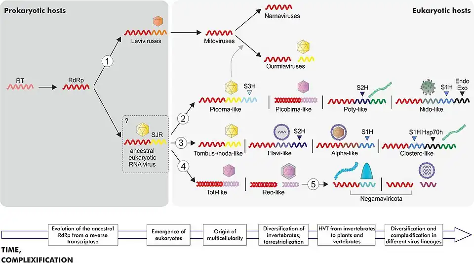 - 1 2 3 Wolf Y. I., Kazlauskas D., Iranzo J., Lucía-Sanz A., Kuhn J. H., Krupovic M., Dolja V. V., Koonin E. V. Origins and Evolution of the Global RNA Virome. (англ.) // MBio. — 2018. — 27 November (vol. 9, no. 6). — doi:10.1128/mBio.02329-18. — PMID 30482837.