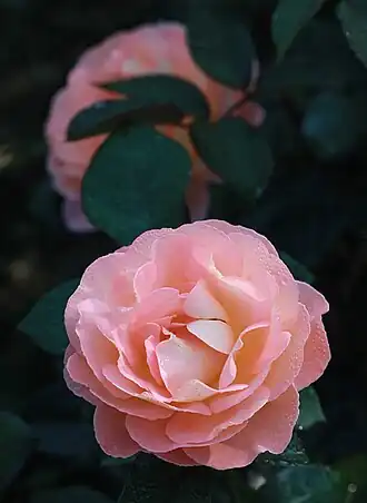 | 'Compassion' Harkness, 1972 Плетистая крупноцветковая роза, цветки оранжево-розовые | ||||||||||||||||