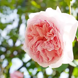 Цветки абрикосово-розового цвета, 8—10 см в диаметре, махровые, чашевидные. Лепестков около 41.