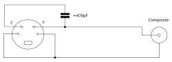 Переходник с S‑Video на вход композитного видеосигнала весьма прост: для этого выход «земля» подключается к наружному контакту (кольцу) «тюльпана», а сигнал цветности C, смешивается с сигналом яркости Y через конденсатор ёмкостью 470 пФ и подключается к центральному контакту.