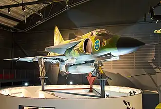 Сааб 37 «Вигген» (швед. Saab 37 Viggen, viggen — удар молнии) — шведский многоцелевой истребитель третьего поколения. Разработан компанией SAAB в 1960-е годы для замены истребителя Saab 35 Draken[3]. В 1971 году принят на вооружение ВВС Швеции, где использовался до 2005 года. Первый в мире серийный военный реактивный самолёт с передним горизонтальным оперением (аэродинамическая схема биплан-тандем — «утка» с близкорасположенным передним крылом — схема, в которой основное крыло расположено в зоне скоса потока от переднего горизонтального оперения (ПГО)).