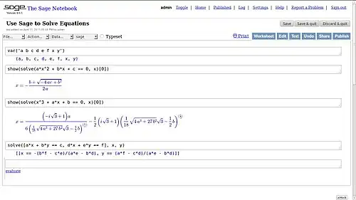 solve(a*x^2 + b*x + c, x) # returns [x == (-sqrt(b^2 - 4*a*c) - b)/(2*a),