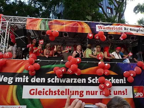 Главной целью гомосексуальных социал-демократов — уравнивание в правах однополых гражданских партнёров с обычными разнополыми супругами по всем направлениям, в первую очередь в вопросах налогообложения. СДПГ, также как и «Партия зелёных», выступают за полное разрешение однополыми семьями усыновлять детей[1][2].