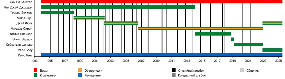 Scooter — музыкальное трио, но с момента основания «незримым» четвёртым участником коллектива является менеджер Йенс Теле. Он и фронтмен Эйч Пи Бакстер — единственные, кто остался в группе из оригинального состава. Смена третьего участника через каждые несколько лет в историографии Scooter связана с открытием очередной «главы» в творчестве.