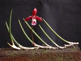Литофитное растение маленького или среднего размера с ползучим корневищем. Псевдобульба вальковатая, короткая, несёт одиночный прямой острый лист длиной до 25 см. Соцветие с одним цветком. Цветёт летом[7].