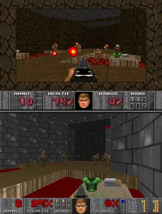 Сравнение версий игры Doom для игровой приставки Sega 32X (сверху) и для персонального компьютера (снизу). Версия для 32X заметно урезана по сравнению с версией для DOS. Уровень 9, Deimos Anomaly, идентичный уровню E2M1 в DOS-версии The Ultimate Doom.