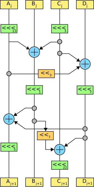 где обозначает циклический битовый сдвиг, а — битовый сдвиг. В последнем раунде это линейное преобразование заменено дополнительным смешиванием с ключом