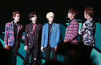 ![]() SHINee в фотосессии для модного издания Marie Claire, 2018 года. Слева направо: Минхо, Тхэмин, Оню и Кхи | |