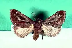Имаго — тёмно-коричневая моль. Гусеница зелёная, по обоим концам тела коричневая, в центре имеется коричневое пятно с белой окантовкой, напоминающее седло. Длина тела 2,5—3 см. С обоих концов тела у гусеницы пара мясистых отростков—«рожек» с волосками-жалами, содержащими яд. Укол может быть болезненным и вызвать отёк, тошноту, сыпь, которые держатся несколько дней.