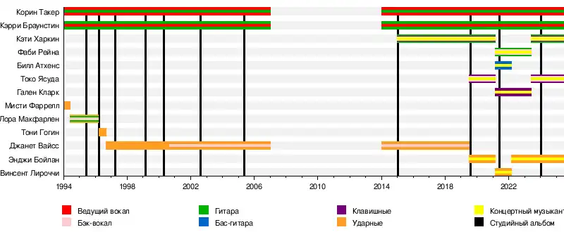 ![]() Sleater-Kinney выступает в 2019 году. Слева-направо: Браунстин, Такер. | |