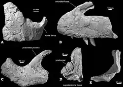 Черепная коробка животного имеет множество продвинутых черт. Наиболее заметной является воронкообразная конструкция на нижней части мозговой коробки, образованное очень широкой округлой базисфеноидной костью. Глубокая борозда, называемая базисфеноидным углублением, прорезает заднюю часть этой воронки. Над воронкой находится очень тонкий участок черепной коробки, который образован глубокими углублениями в базисфеноиде[1].