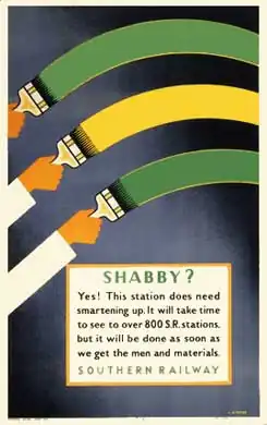 Southern Railway была особенно успешна в рекламе. Снижение важности линии до Портсмута через Хоршем в Западном Сассексе было встречено населением враждебно, приведя к катастрофе в отношении к компании[65]. Это стало причиной появления первого современного отдела по отношениям с общественностью в 1925 году. Положительное мнение о компании успешно развивалось вплоть до Второй мировой войны, основываясь на кампании «Лучшая в мире пригородная электричка»[66].