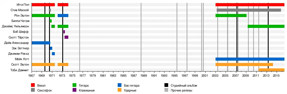 Одноимённый дебютный альбом The Stooges продюсировал Джон Кейл из Velvet Underground. Альбом вышел в 1969 году и занял 106 место в хит-параде США. В следующем году вышел второй альбом Fun House, записанный немного изменённым составом. После его выхода стала обостряться тенденция к распаду группы, связанная не в последнюю очередь с поголовным злоупотреблением наркотиками (особенно отличался этим Игги Поп). Кроме того, вскоре после записи второго альбома Игги выгнали из группы из-за инцидента с наркотиками[7] Дэйва Александера, умершего в 1975 году от пневмонии на фоне алкоголизма[8]. В 1972 году группа практически распалась. В том же 1972-м Игги познакомился и подружился с Дэвидом Боуи. Боуи пригласил двух участников Stooges — Игги и Джеймса Уильямсона — в Великобританию и обеспечил им контракт с Columbia Records. Была предпринята попытка возродить The Stooges с новыми британскими музыкантами, но, не найдя подходящих людей, Игги вернул в группу братьев Эштон. В таком составе, под названием Iggy & The Stooges, они записали свой последний (до воссоединения в 2000-х) альбом Raw Power (1973).