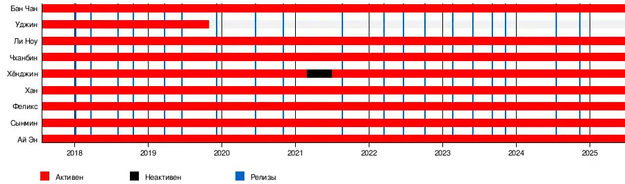 28 октября 2019 года Уджин покинул группу и разорвал контракт с лейблом JYP Entertainment по нераскрытым личным причинам[256]. С февраля по июль 2021 года Хёнджин находился в перерыве из-за обвинений в издевательствах, однако в августе возобновил групповую деятельность[257][258]. Бан Чан, Чханбин и Хан также являются участниками внутреннего продюсерского юнита 3Racha в составе Stray Kids и постоянно участвуют в написании текстов и композиций для группы[259].