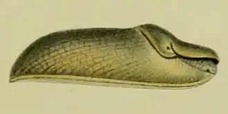 Раковина продолговато-овальная, с микроскопической кольцевой исчерченностью. У одного экземпляра с длиной 44 мм (в ползущем состоянии) её размеры составляли 7 × 4,7 мм[1].