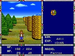 «Режим путешествия» включается когда вы выходите за пределы города или попадаете в опасную локацию (в пещеру например). Графически это вид от первого лица и псевдо-3D с плавной анимацией при поворотах, обычное для лабиринтных RPG того времени (самый близкий пример, Double Dungeons для PC-Engine). Справа от игрового экрана находится карта (если карта этой местности у вас есть), а внизу Запас Магии (мана), Запас Здоровья (стамина), текущее число очков Опыта (экспа), золотой запас, и текущее Выбранное Заклинание.