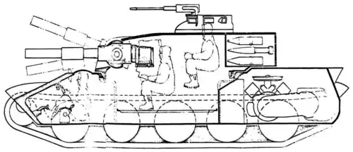 - T95 — оригинальный танк, стабилизированная 90 мм гладкоствольная пушка Т208 в безоткатной установке пулемётом M4 16 mm.