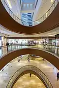 - В подиуме расположены многоуровневый торговый центр Taikoo Hui Mall со 180 магазинами, ресторанами и супермаркетом[13][14][15], автомобильный паркинг, культурный центр с библиотекой, центр исполнительского искусства на 1 тыс. мест, станция метро, на крыше разбиты сады.