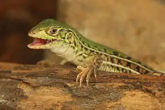 Основной фон тела зелёный. По бокам спинной стороны от слуховых отверстий до середины длины хвоста проходят две белые линии шириной 1—3 чешуйки. Похожие линии идут по бокам тела и хвоста на уровне конечностей. Между этими линиями проходят ряды поперечных чёрных пятен неправильной формы. Хвост обычно коричневых оттенков, с размытым рисунком в задней части. Брюхо беловатое, без пятен. Верхнегубные щитки обычно светлые, у некоторых особей с редкими тёмными пятнами. Самцы с голубоватым оттенком на боках[1].