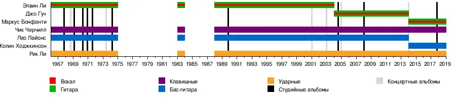 - Элвин Ли — вокал, гитара (1966—1974, 1983, 1988—2003; умер в 2013)