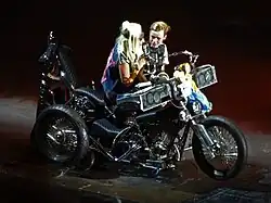 - «Hair» и «Electric Chapel»: Синие штаны и топ, поверх которого короткая куртка того же цвета; рукава отделены от куртки, с них свисает разрезанная ткань, похожая на волосы. На танцорах надеты джинсовые костюмы. Но на последнем концерте Гага и танцоры не меняли костюмы после «Bad Kids».