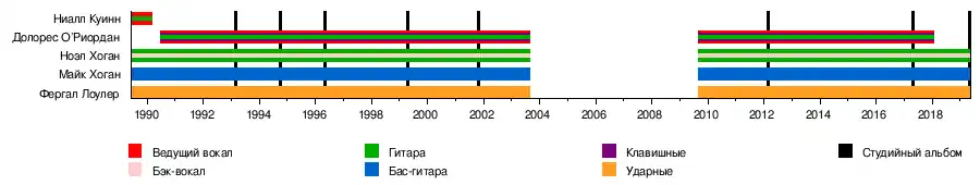 - Долорес О’Риордан — ведущий вокал, гитара, клавишные (1990—2003, 2009—2018; умерла в 2018)