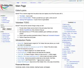 The Hidden Wiki является открытым сервисом сети Tor и доступен через псевдо-домен верхнего уровня .onion[3]. Сайт работает на вики-движке и предоставляет ссылки на скрытые сервисы Тора, а также на обычные сайты вне сети Tor (которые могут быть доступны без использования Tor-браузера). Каталог Hidden Wiki включает в себя ссылки на сайты с детской порнографией, электронной коммерции, продающие контрабандные товары, включая оружие, фальшивые деньги, документы, удостоверяющие личность, номера кредитных карт, наркотики, как, например, сервис Silk Road, закрытый правоохранительными органами в октябре 2011 года[4].