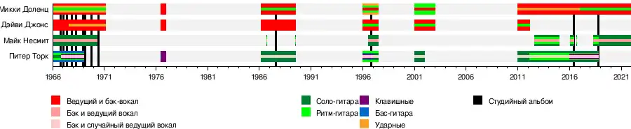 - Майкл Несмит — соло-гитара, клавишные, бэк и ведущий вокал (1966—1970, 1986, 1989, 1996—1997, 2012—2014, 2016, 2018—2021; умер в 2021)