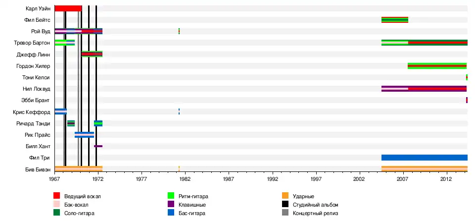 Рой Вуд Карл Уэйн Бив Бивэн Тревор Бёртон Эйс Кеффорд Рик Прайс Джефф Линн Ричард Тэнди Билл Хант Нил Локвуд Фил Бейтс Гордон Хилер Фил Три Тони Кесли Эбби Брант |
