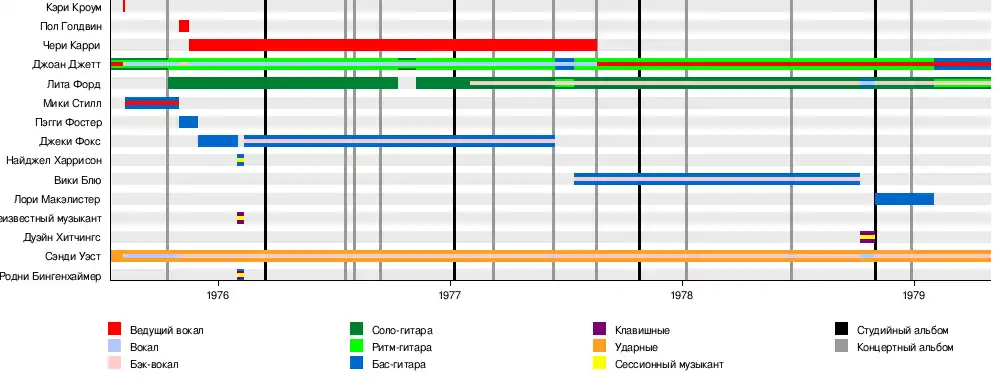 Вскоре выяснилось, что Кром — слабая вокалистка, и её заменила в составе Мики Стил, начавшая осваивать и бас-гитару. Поздней осенью 1975 года трио записало демо Born To Be Bad. Стил покинула состав (позже она присоединилась к The Bangles), а на её место пришла найденная по объявлению гитаристка Лита Форд. Вокалисткой стала Шери Кэрри (англ. Cherie Currie), а бас-гитаристкой — сначала некая Пэгги Фостер, продержавшаяся в группе несколько недель, а затем — Джеки Фокс (англ. Jackie Fox), прежде игравшая на гитаре. Все участницы квинтета к моменту его образования практически не вышли из подросткового возраста[6].