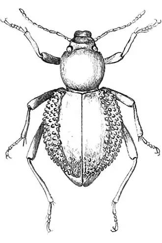 Жуки-чернотелки средних размеров (длина тела около 2 см). Бугорки надкрылий размещены плотно (1,0—1,5 диаметра друг от друга), латерально достигают плечей; надкрылья круглые. Бугорки на боках надкрылий круглые/шаровидные, вертикально прямые. Диск переднеспинки только с микропунктурой; надкрылья не покрыты волосками. На склоне и боках надкрылий имеют бугорки (без соответствующих волосков) (отсутствуют на диске). Развит расширенный и более широкий у основания эпиплеврит, окружающий пятый вентрит[2][3].
