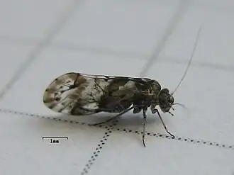 Проксимальный отрезок CuA1 и вершина ячейки ap (m—cua1) расположены на одной прямой, так что ячейка ap выглядит треугольной. Рамка пениса симметричная, на вершине двух-трёхлопастрая. Генитальная пластинка самки с укороченной трапециевидной медиальной лопастью. Наружная створка яйцеклада треугольная[1].