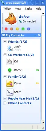 - Astra: специальный протокол доступный только для пользователей Trillian. Кроме передачи текстовых сообщений, позволяет: