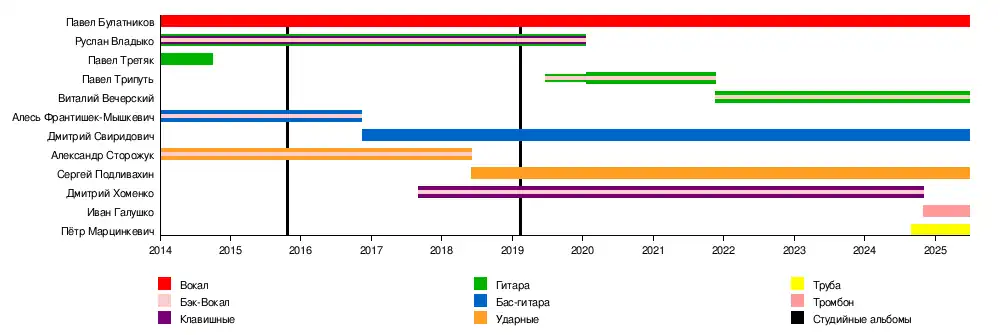 - Алесь Франтишек-Мышкевич — бас-гитара, бэк-вокал (сентябрь 2014 — ноябрь 2016)