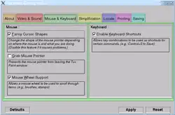 Настройка Tux Paint осуществляется отдельной программой tuxpaint-config. С её помощью можно регулировать различные параметры: разрешение экрана, полноэкранный режим, звуковые эффекты, вывод изображения на печать, закрытие программы.